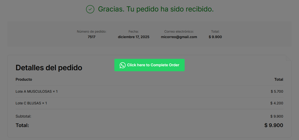 4 – Esto generará el botón de WhatsApp en el que deberás pinchar para contactarnos. Al pinchar en el botón se generará el resumen de la compra y automáticamente nos lo enviará por WhatsApp.